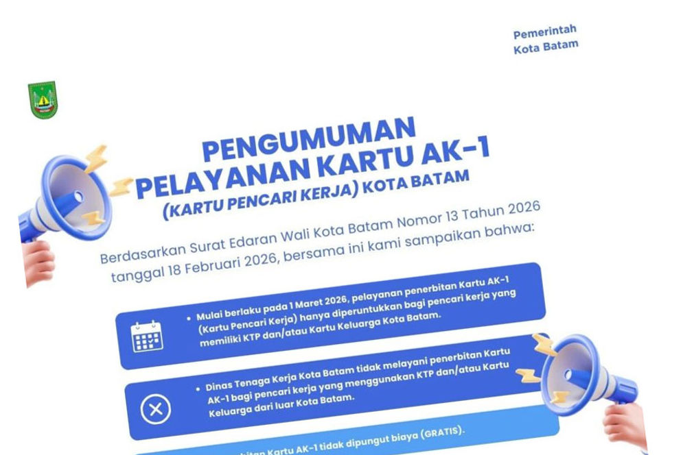 BATAM (sijori.id) — Wali Kota Batam Amsakar Achmad menerbitkan Surat Edaran (SE) Nomor 13 Tahun 2026 tentang Pelayanan Kartu Pencari Kerja (AK/1) atau Kartu Digital Angkatan Kerja (SIAPkerja-ID). Kebijakan yang mulai berlaku 1 Maret 2026 itu membatasi layanan penerbitan AK/1 hanya bagi pencari kerja yang memiliki KTP atau Kartu Keluarga (KK) berdomisili di Batam.