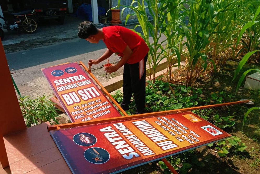MADIUN (sijori.id) - Upaya untuk membangkitkan usaha mikro kecil dan menengah (UMKM) terus digalakkan Karang Taruna (Karta) Persada Dagangan dari Desa Dagangan, Kecamatan Dagangan, Kabupaten Madiun, Jawa Timur. Karta yang tergabung dalam Heppiii Community ini membuatkan papan nama bagi para perajin anyaman bambu di Dusun Dagangan. Cara ini dilakukan untuk memudahkan calon pembeli yang ingin bertransaksi langsung dengan para perajin.