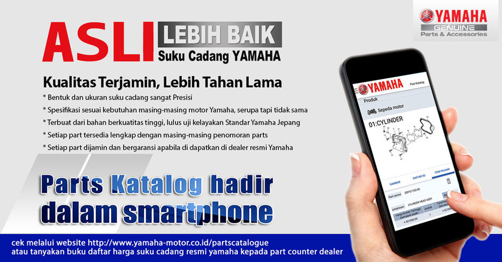 Semuanya disediakan untuk memudahkan konsumen mengakses informasi ataupun mengetahui produk dan layanan yang dibutuhkan. Yang sering dicari konsumen juga adalah suku cadang asli yang juga disediakan oleh Yamaha. Semua bisa diperoleh cukup dengan mengakses aplikasi Yamaha Part Electric Catalogue (YPEC IDN) yang menyediakan informasi detail tentang model, harga, ketersediaan dan lainnya terkait suku cadang asli Yamaha yang diinginkan.