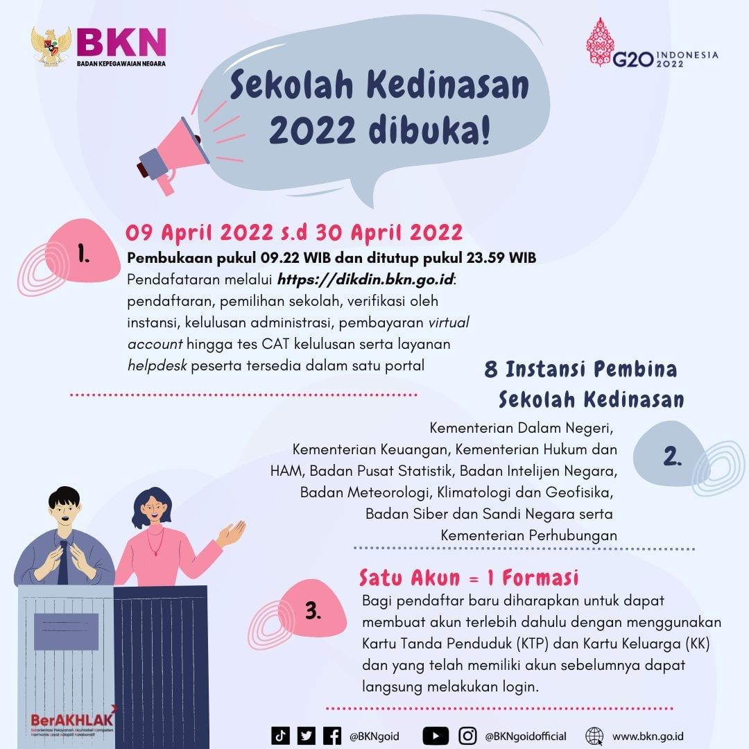JAKARTA (sijori.id) – Badan Kepegawaian Negara (BKN) melalui Deputi Bidang Sistem Informasi Kepegawaian mengumumkan pendaftaran seleksi calon mahasiswa dan taruna Sekolah Kedinasan atau Dikdin 2022 akan dibuka mulai 9 April 2022 pukul 09.22 WIB hingga 30 April 2022 pukul 23.59 WIB.